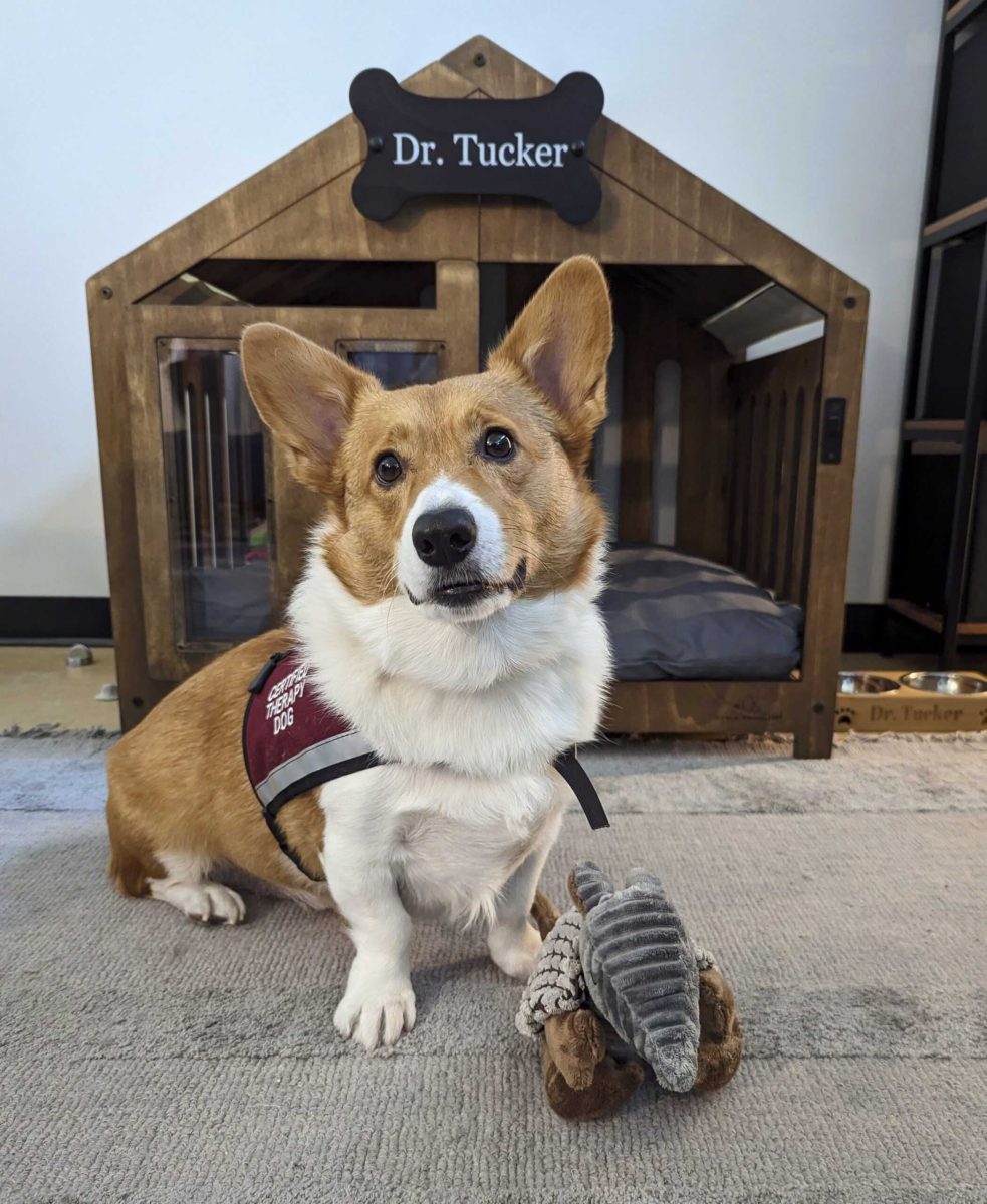 A student walks into the Advocacy Center, shaken after a tough week of exams. As she sits down, Dr. Tucker — a Pembroke Welsh Corgi with a wagging tail and gentle demeanor — strolls over and rests his head on her knee, his wide eyes staring upward. Almost immediately, her tense shoulders relax and she smiles.
