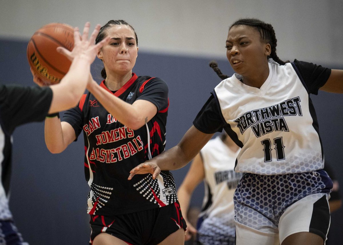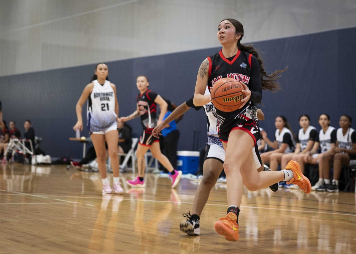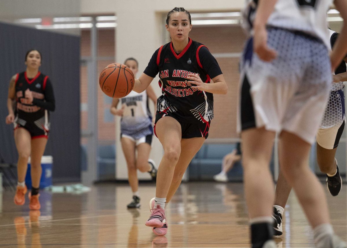 SAC Point Guard Devyn Castillo drives past a Northwest Vista defender during the Texas Collegiate Athletic Conference championship game at Northeast Lakeview College Sunday. Photo by A. De Leon.