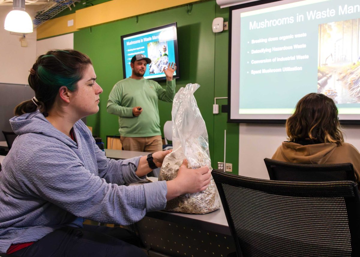 Rowland provided oyster mushrooms for audience members to examine and taught attendees basic fungal functions and potential environmental applications.