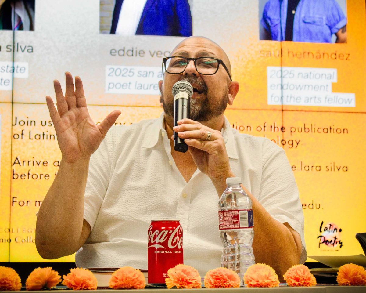 Local poets Ire’ne Lara Silva, Saúl Hernández and Eddie Vega visited campus for a poetry reading and discussion hosted by SAC’s Mexican American Studies program in the Nursing & Allied Health Complex (NAHC) Tuesday.