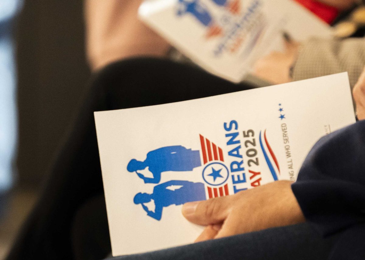 A section of the Victory Center’s front lawn was reserved as a memorial garden. A banner thanking veterans was staked into the ground, flanked by a red, flowered wreath. Various flags were inserted into the grass, with the names of the service members handwritten on them by the people gathered. Each piece of the printed material waving in the wind.